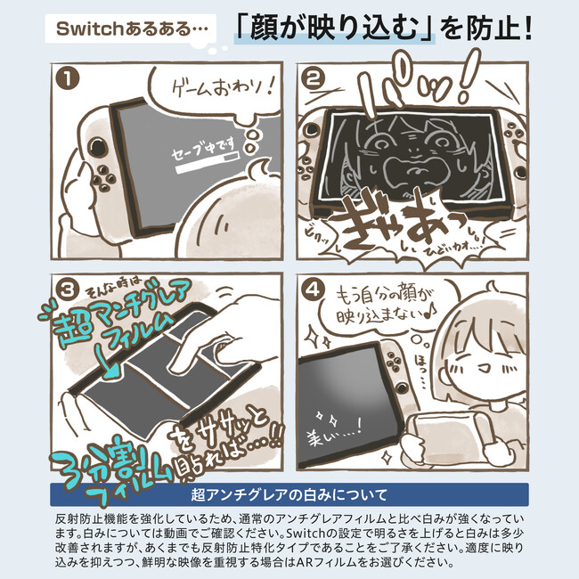 Switchあるある「暗転した時に自分の顔が映る」を徹底的に防止する超アンチグレア保護フィルム発売!反射防止のさらに上をいく"超反射防止"タイプです。さらさら指滑り&映り込みを抑えたい方におすすめ