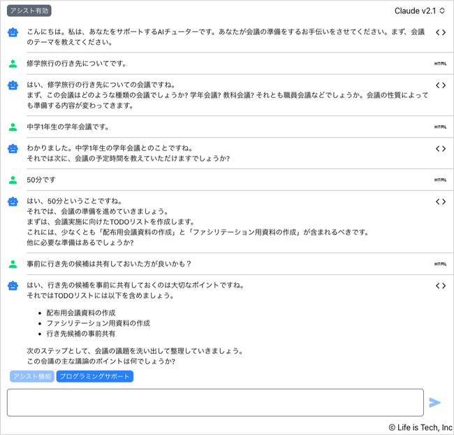ライフイズテックでは公教育での生成AI利用における「生徒目線」「教員目線」での課題を解決し、安心安全に生成AIを利活用できる環境の提供に取り組んでいます。本サービスでは、特に教職員の利用に特化した機能やUI・UXの最適化を図っています。