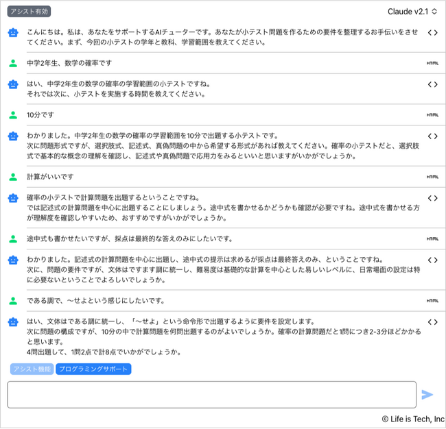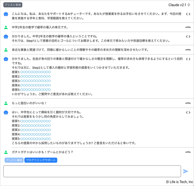 通常、生成AIの能力を引き出すためにはプロンプトの工夫が重要であり、十分に使いこなすためにはプロンプトに関するスキルと経験が必要となります。ライフイズテックでは独自のアシスト機能の提供により、校務での活用の利用シーンを選択するだけで自動的に必要なプロンプトが設定され、生成AI初心者でも難しいプロンプトの調整を意識することなく、すぐにその能力を最大限引き出せる環境を実現します。