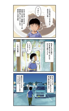 本作の執筆のきっかけとなった、関越自動車道・三芳パーキングエリアの「深谷ネギそば」に始まり、キャンプ気分な「スペシャル牛タンパワー丼」が食べられる東北自動車道・国見サービスエリア、さらには故郷・近江の懐かしの「近江ちゃんぽん」など、巡ったエリアは30カ所。