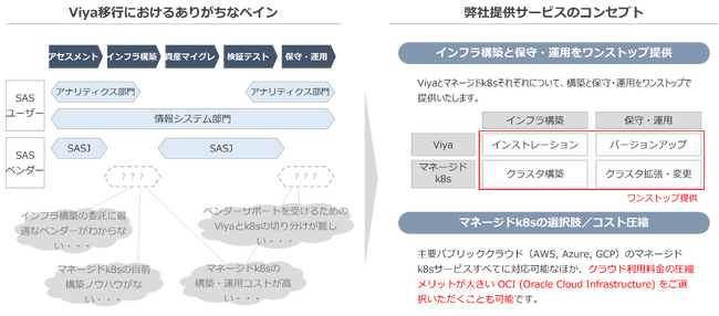すでにご利用中のクラウドサービスに合わせて、マネージドkubernetesサービスの構築・SAS Viyaインストールをするサービスです。主要パブリッククラウド(AWS, Azure, GCP)のマネージドkubernetesサービスすべてに対応可能なほか、クラウド利用料金の圧縮メリットが大きい OCI (Oracle Cloud Infrastructure) をご選択いただくことも可能です。OCIを利用する場合、SASとしてのサポートレベルは限定サポートとなりますが、サポートレベルの差分につきましては、保守サービス内で吸収することが可能です。