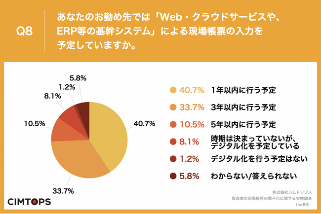 Q2で「表計算ソフト(Excelなど)」「PDF編集ソフトウェア」と回答した方に、「Q8.あなたのお勤め先では「Web・クラウドサービスや、ERP等の基幹システム」による現場帳票の入力を予定していますか。」(n=86)と質問したところ、「1年以内に行う予定」が40.7%、「3年以内に行う予定」が33.7%という回答となりました。