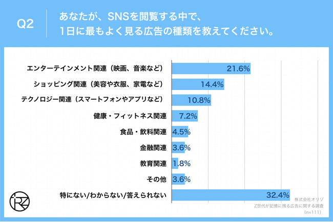 「Q2.あなたが、SNSを閲覧する中で、1日に最もよく見る広告の種類を教えてください。」(n=111)と質問したところ、「エンターテインメント関連(映画、音楽など)」が21.6%、「ショッピング関連(美容や衣服、家電など)」が14.4%という回答となりました。