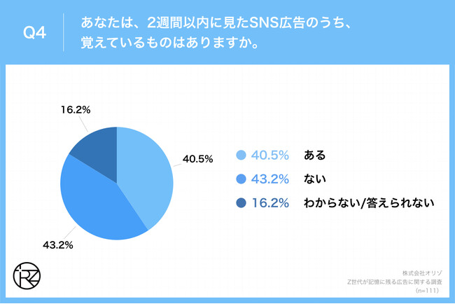 「Q4.あなたは、2週間以内に見たSNS広告のうち、覚えているものはありますか。」(n=111)と質問したところ、「ある」が40.5%、「ない」が43.2%という回答となりました。