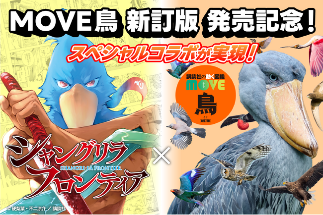 子どもに大人気の図鑑「講談社の動く図鑑MOVE」シリーズの新刊『鳥 新訂版』の表紙を飾るハシビロコウと、累計650万部を突破した週刊少年マガジンで連載中の『シャングリラ・フロンティア』のスペシャルコラボが実現しました!
