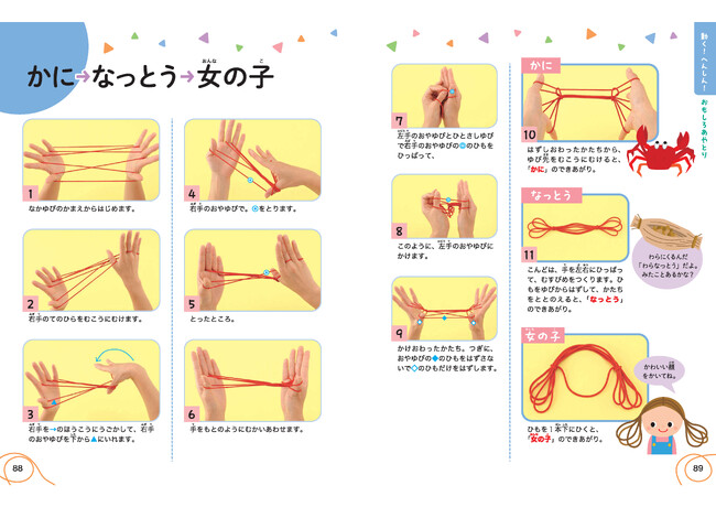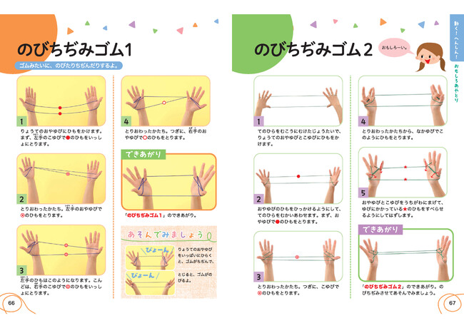 「のびちぢみゴム」、「びゅんびゅんやりなげ」など動かして遊べるあやとりから、「かに→なっとう→おんなのこ」、「てっきょう→かめ→ゴム→ひこうき→かぶと→おたまじゃくし」など変身するあやとりを紹介。