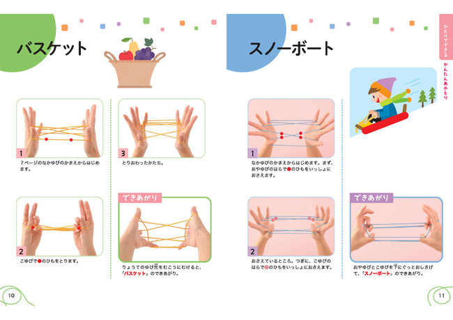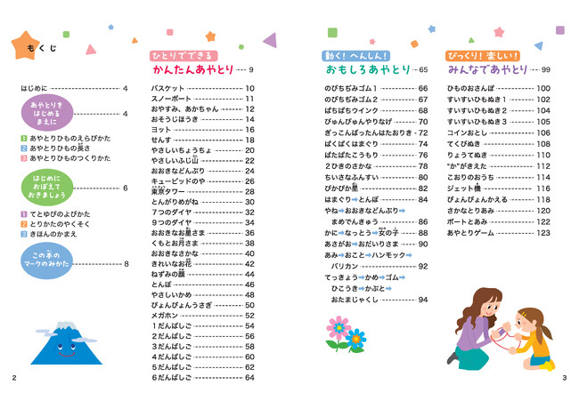 「ひものおさんぽ」、「コインおとし」などトリックあやとり、「こおりのおうち」などストーリー性のあるあやとり、2人以上で遊べる「あやとりゲーム」などを掲載。