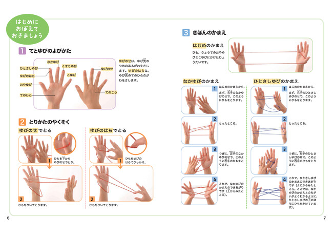 本書は、あやとりひもの選び方から解説し、とり方は多くの写真で解説していますので、はじめての方にもおすすめ。漢字にはすべてルビ(読みがな)がふっているので、子どもでも大丈夫です。