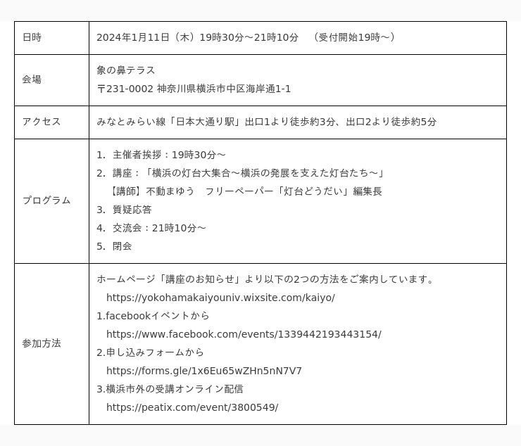 ヨコハマ海洋市民大学実行委員会は2024年1月11日(木)に、ヨコハマ海洋市民大学2023年度講座の第8回目「横浜の灯台大集合~横浜の発展を支えた灯台たち~」を開催いたします。この講座は、次世代へ豊かで美しい海を引き継ぐために、海を介して人と人とがつながる“日本財団「海と日本プロジェクト」”の一環です。