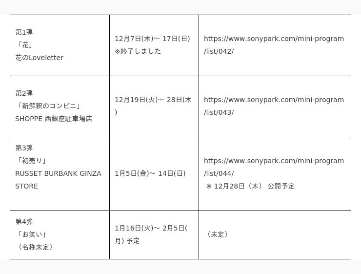 <Sony Park Mini年末年始営業のお知らせ>