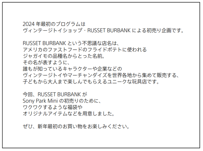 Sony Park Mini 冬の連続プログラム第3弾 子どもから大人まで好奇心を刺激する初売り! RUSSET BURBANK GINZA STORE NEW YEAR’S SALE