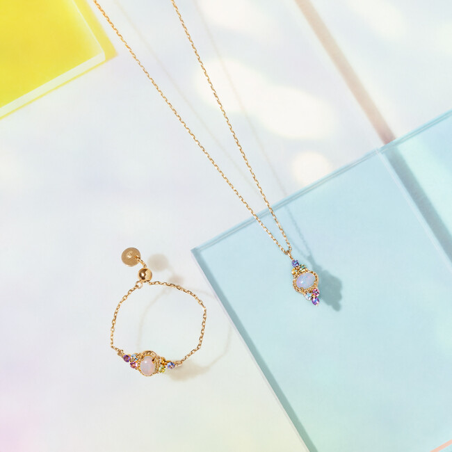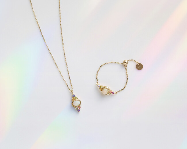 オパールを中心に淡い7色のカラーストーンをあしらったネックレスとチェーンリングは、オーロラをイメージしたカラーミックスが楽しいデザイン。7色のものを一度に身に着けると厄除けになるとも言われています。