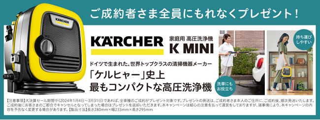 2024年1月4日から2024年3月31日までの間で、「SOMPOで乗ーる」でご成約者さま全員にケルヒャー「K MINI」をプレゼントいたします。
