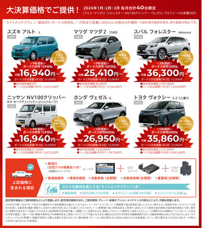 さらに、2024年1月・2月・3月の各月合計40台※限定で、「SOMPOで乗ーる」で人気の6車種を大幅値引きでご提供します。※アルト、マツダ2、フォレスター、NV100クリッパー、ヴェゼル、ヴォクシーの6車種合計