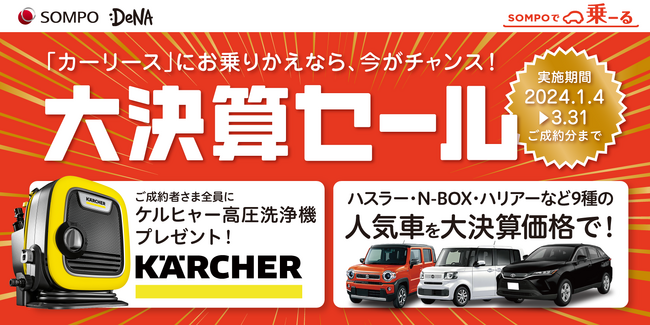 株式会社DeNA SOMPO Carlife(本社:東京都渋谷区、代表取締役社長:水沼 義尚)が提供するカーリースサービス「SOMPOで乗ーる」( https://sompo-de-noru.jp/ )は、2024年1月4日から大決算セールを開催します。