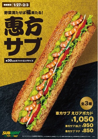 毎年恒例の恵方サブに、今年はサブウェイの定番人気ナンバー1サンド、えびアボカドが登場。約30cmのフットロングをいつもよりお得な価格で食べて、今年1年の福招きをしましょう!