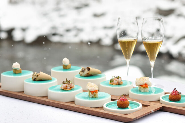 幻想的な雪景色と渓流を眺めながら楽しむアペリティフ