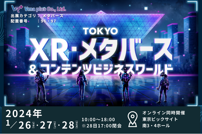 メタバースWeb3のコンテンツ企画・ディレクションを行うVma plus(ブイマプラス)株式会社(本社:東京都品川区、代表:津田徹)は、2024年1月26日~1月29日にXR・メタバース等産業展2024実行委員会が主催する「TOKYO XR・メタバース&コンテンツビジネスワールド」に出展することを発表いたします。