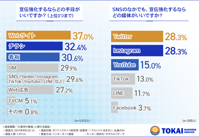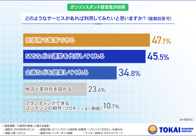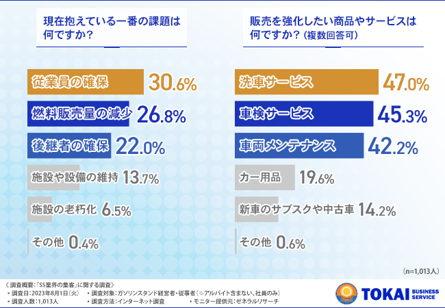 東海ビジネスサービス株式会社(所在地:東京都中央区、代表取締役社長:田中 亮宇)は、ガソリンスタンド経営者・従事者を対象に「SS業界の集客」に関する調査を実施しました。