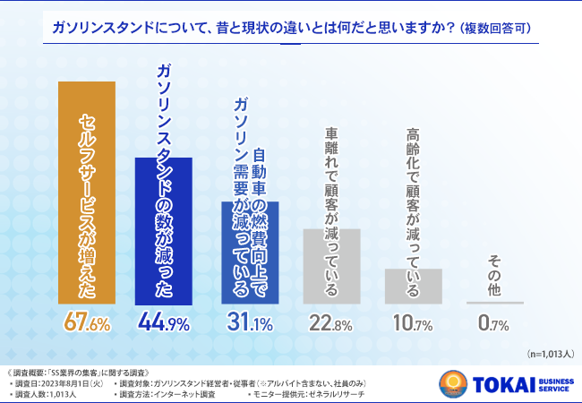 「ガソリンスタンドについて、昔と現状の違いとは何だと思いますか?(複数回答可)」と質問したところ、『セルフサービスが増えた(67.6%)』と回答した方が最も多く、次いで『ガソリンスタンドの数が減った(44.9%)』『自動車の燃費向上でガソリン需要が減っている(31.1%)』『車離れで顧客が減っている(22.8%)』『高齢化で顧客が減っている(10.7%)』と続きました。