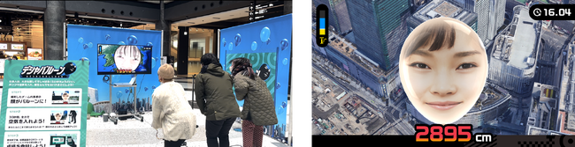 自転車の空気入れのようなポンプを全力で押すと、チーム代表者の顔を取り込んだ顔型バルーンに空気が入り、顔がどんどん膨らんでいきます。制限時間30秒で膨らませられた顔型バルーンの大きさに応じて、得点できます。最初はグランフロント大阪を象徴する屋外スペース「うめきた広場」からスタートし、大きくなるとJR大阪駅が見え、頑張れば宇宙に行くこともできます。自分の存在感をアピールしたくなるでしょう。