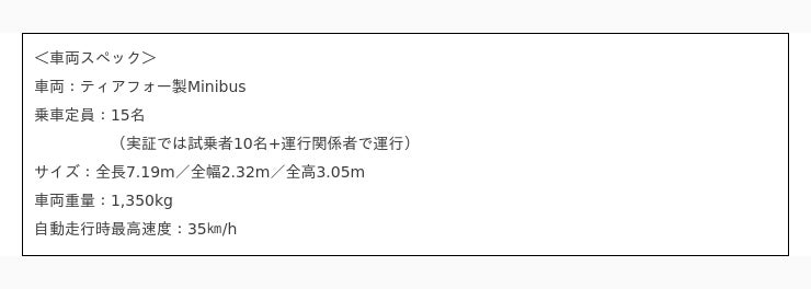 ティアフォーは、2023年10月に道路運送車両法のレベル4認可を取得した自動運転システムの技術、ノウハウを活用した自動運転車両を提供し、特に自動運転走行技術実証に注力します。(https://tier4.jp/media/detail/?sys_id=1dWp9ReZIYKHvP0ZtCKeVF&category=NEWS)