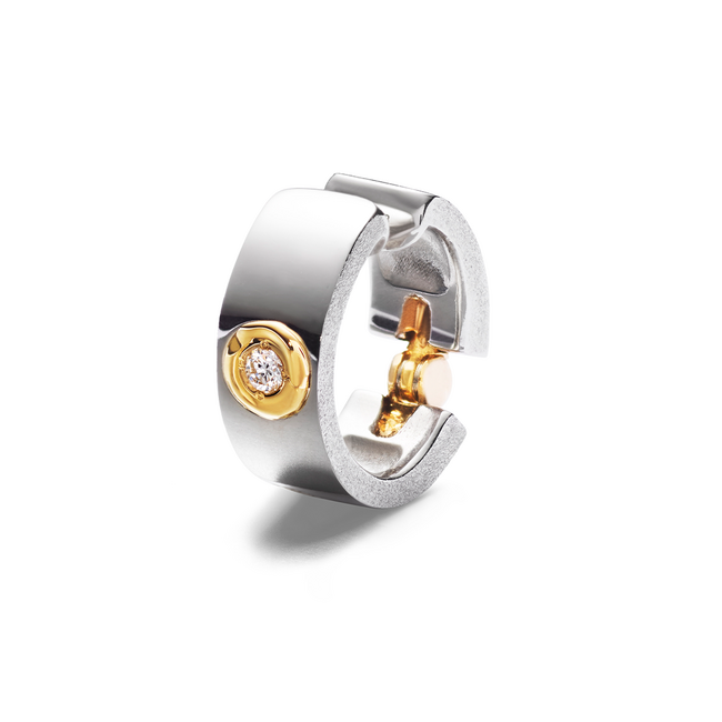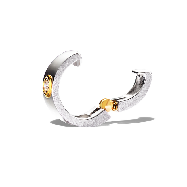 プラチナ900と18金ゴールドのデュオカラー。耳元にボリュームを持たせ、ミニマルでコンテンポラリーな印象を演出。さりげなくセッティングされた天然ダイヤモンドが特徴的です。