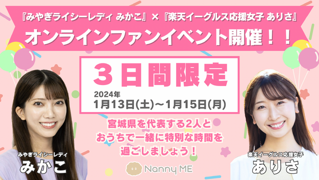 宮城県を代表する2人のタレント、みかこさんとありささんが贈るオンラインファンイベントの初回開催が大成功を収めました。嬉しいことに、多くの方からのお声をいただき、皆様の期待にお応えする形で、オンラインファンイベント第2弾の開催が決定いたしました。NannyMEのオンラインファンイベントは、スマホ一つで自分の快適な場所からイベントに参加できるため、いろんな方に参加いただけます!2人と画面上で直接的なやりとりが可能なので、新たな情報や裏話、秘話など、2人の魅力をより知ることができる時間です。第2弾も一緒に特別な時間を過ごしましょう!