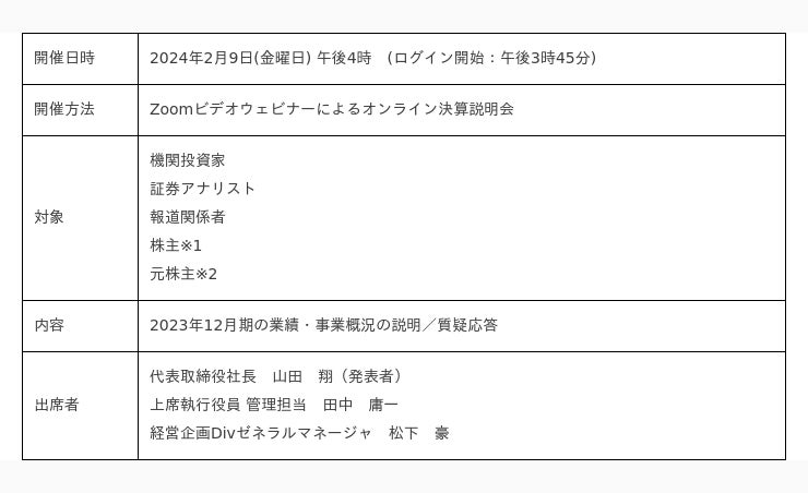 株主・投資家出席型オンライン決算説明会開催のお知らせ