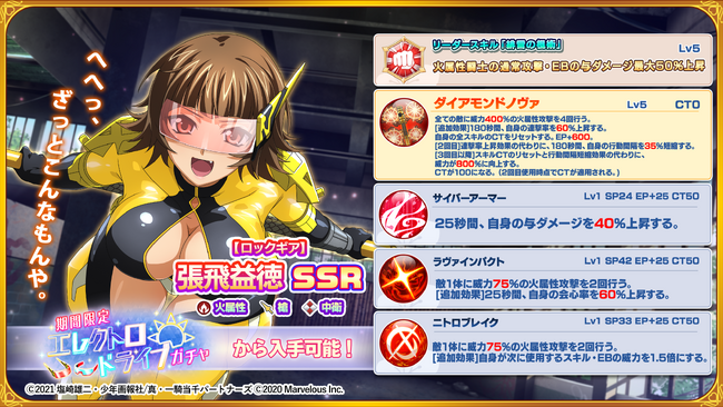 本日開始の「エレクトロドライブガチャVol.1」では、新たに「【ロックギア】張飛益徳」(CV:茅原 実里)が登場。