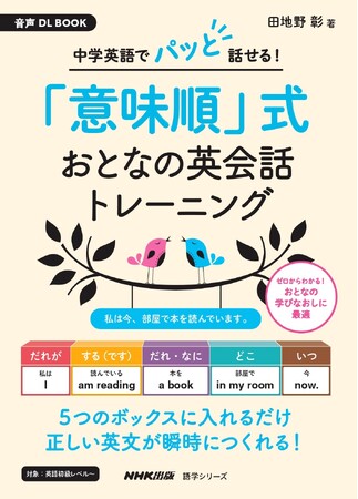 『音声DL BOOK 中学英語でパッと話せる! 「意味順」式 おとなの英会話トレーニング』(田地野彰著)がNHK出版から1月13日に発売されました。「中学、高校で英語を勉強したのに話せない」「英語になると言いたいことが口からスッと出てこない」といったお悩みを解決してくれるのが本書。英単語を「だれが」「する(です)」「だれ・なに」「どこ」「いつ」の「意味順」ボックスに入れるだけで、文法的に正しい英文が完成します。しかも、高度な文法用語は必要なし。中学3年間で学ぶ文法だけでできるので、総復習をしたい現役生にも、大人の学び直しにも最適です。
