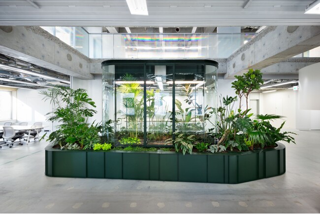 JINSのファブリカ デラリアは、約8.22平方メートル の植物プールと、ファブリカ デラリアの心臓部である約4平方メートル のスペースを占めるガラスケース2パーツで構成されています。カシワババンビーノ、モンステラなど多彩な91鉢もの熱帯植物が、土ではなく軽石や純粋ゼオライト、活性炭の混合物に植え替えられて自生し、空気を浄化しながら、新しい形のアートとしてJINSの新社屋にインスピレーションをもたらしています。