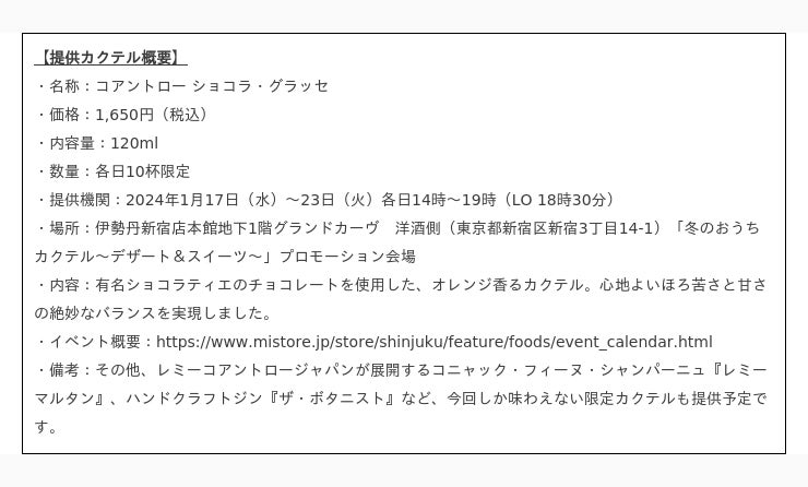 ”量よりも質"という観念を軸にサステナブルな栽培法を取り入れ、ワイン&スピリッツ業界に革新をもたらすレミーコアントロージャパン株式会社(東京都港区/ゼネラルマネージャー ザビエ・タロ)が展開するプレミアム・オレンジリキュールブランド コアントローは、2024年1月17日(水)~1月23日(火)の間、伊勢丹新宿店で開催されるプロモーションイベント『冬のおうちカクテル~デザート&スイーツ~』にて、限定カクテル『コアントロー ショコラ・グラッセ』を提供することを決定。『コアントロー ショコラ・グラッセ』を堪能できるのは、バレンタインデーに先駆けて開催される本イベントのみの貴重な機会となります。