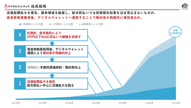 今後も引き続き、流通総額1,000億達成に向けて、「3万円以下のto C現金支払い」を、1.広告領域 2.人材領域 3.キャッシュレス領域の3軸にて網羅を目指してまいります。各領域の網羅においても重要度の高い資金移動業については、2024年2月に本申請を予定、2024年春取得に向け、着実に歩を進めております。今後も、各領域における取り組みを強化し、2027年9月期に掲げている流通総額1,000億円を達成することで、圧倒的低手数料を実現し、より多くの企業様にご利用いただけるよう、更に邁進してまいります。