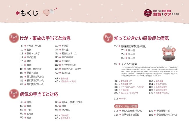 本書には、すり傷・切り傷、打撲や骨折などのけがだけでなく、発熱やけいれん、子どもがかかりやすい感染症など、あらゆるけがや病気に対応しています。