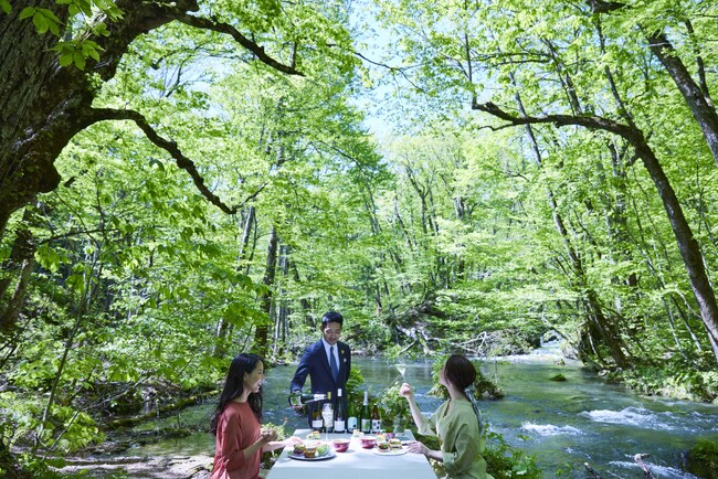 奥入瀬(おいらせ)渓流沿いに建つ唯一のリゾートホテル「星野リゾート 奥入瀬渓流ホテル」では、2024年4月22日~5月31日の平日限定で、きらめく新緑の絶景を眺めながら、渓流沿いでランチを楽しむ「渓流新緑ランチ」を実施します。約100種類の樹木が一斉に芽吹く春の時期に、新緑が一番美しくきらめくスポットに案内します。色とりどりの新緑サンドイッチとソムリエ厳選のワインとシードルを味わう、春限定の特別なプログラムです。