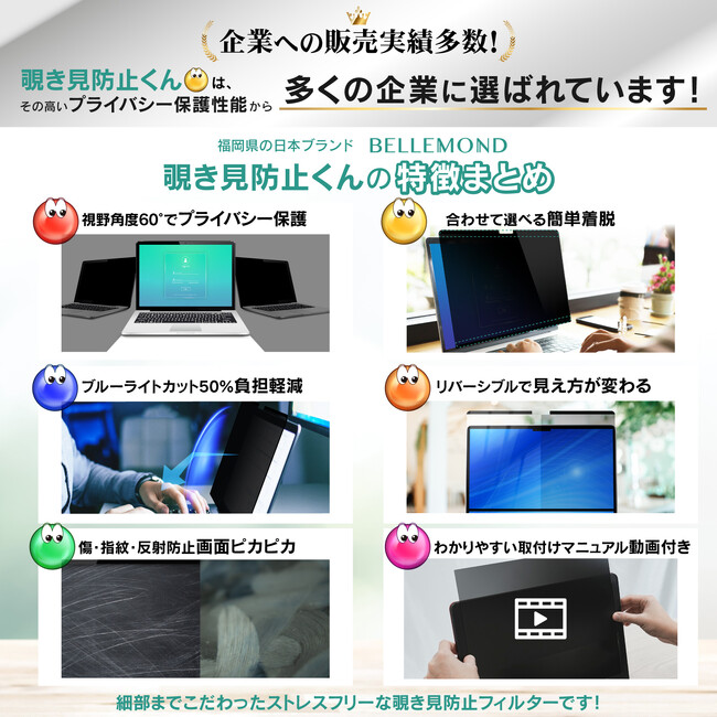 Fun Standard株式会社(本社:福岡県大野城市)が展開するモバイルアクセサリーブランド「BELLEMOND(ベルモンド)」より新商品のお知らせです。2023年12月末、ノートパソコン用プライバシーフィルター「覗き見防止くん 汎用 両面テープタイプ」を発売しました。覗き見防止くんはベルモンドが2023年春より販売している覗き見防止フィルターシリーズで、これまではMacbook専用・Surface専用の展開でした。今回の「汎用 両面テープタイプ」は、デル XPS・Inspiron、HP EliteBook、Lenovo(レノボ)ThinkPad(シンクパッド)、東芝 ダイナブック、富士通ライフブック、パナソニック Let's noteなどに対応する汎用フィルターとなっています。
