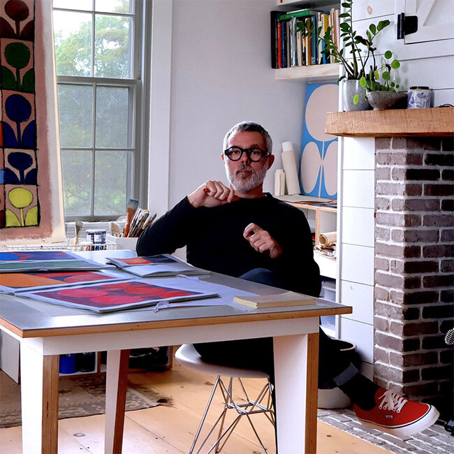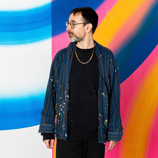 彼の作品は、植物や花、リズミカルな図形、カラフルなグラデーションで構成され、形、色、プロセスを楽しく探求し、私たちの抽象化能力と具体性を求める感覚的欲求が交差または対立する場所を探っていく。