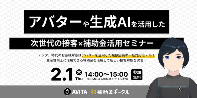 株式会社補助金ポータル(本社:東京都渋谷区、代表取締役:福井彰次)はAVITA株式会社(本社:東京都品川区、代表取締役CEO 石黒 浩)と「アバターを用いた次世代の接客×補助金活用セミナー」と題して無料オンラインセミナーを2月1日木曜日14時より開催します。Zoomでお気軽にご視聴いただけますので、ぜひご参加ください。