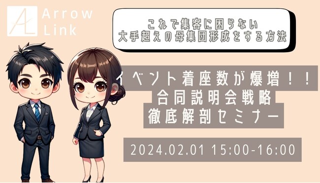 株式会社アローリンク(本社:兵庫県神戸市、代表取締役:蓬莱和真)は、2024/2/1(木)に無料のセミナーを開催します。中小企業様や不人気業界の企業様が抱える、合同説明会での「着座数の減少」や「自社説明会への移行率の少なさ」をテーマにお話しします。合同説明会にブースを設置する上で押さえておくべきポイントをお伝えしますので、是非この機会にご参加ください。