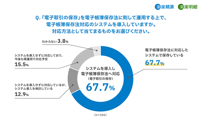 電子帳簿保存法*1に則した運用を開始している企業のうち、「電子帳簿保存法対応のシステムを導入している」と回答した企業は67.7%となり、約7割の企業がシステムによる運用を行っています。