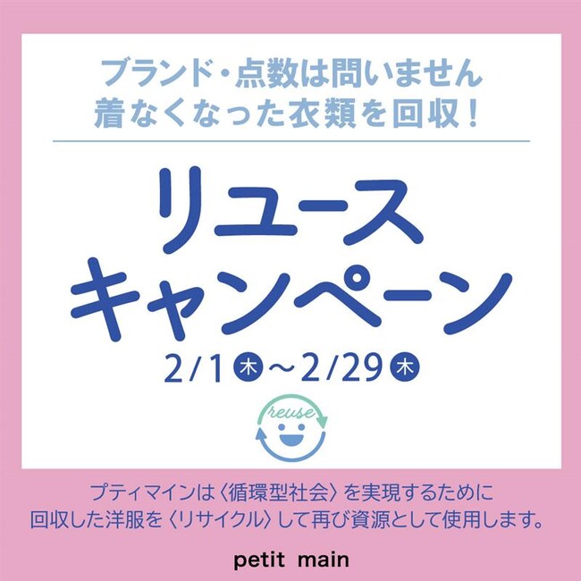 プティマイン全国の直営店舗にて、2月1日(木)~29日(木)の期間中、リユースキャンペーンを開催!店舗にてブランド・サイズを問わず、着なくなった衣類を回収・クーポンと交換します。
