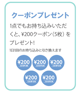 ※お待ち込みの枚数制限はございません。クーポンとの引き換えは原則1日1回となりますが、期間中何度でもお持ち込みいただけます。