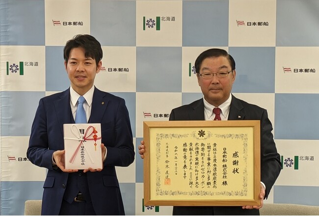 左:北海道知事 鈴木 直道、右:日本郵船 代表取締役社長 曽我 貴也