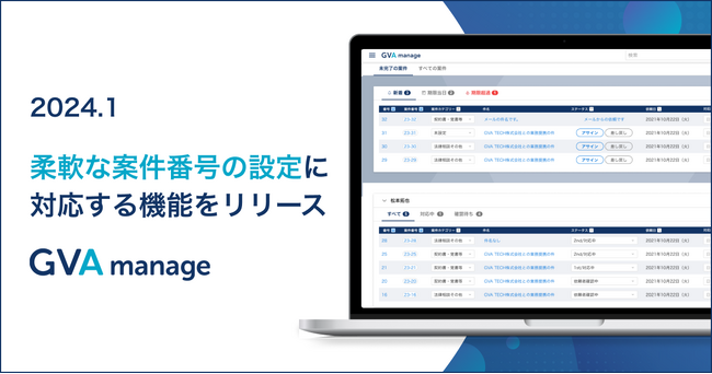 GVA TECH株式会社(本社:東京都渋谷区、代表取締役:山本 俊、以下GVA TECH)は、マターマネジメントシステム「GVA manage(ジーヴァ マネージ)」が、柔軟な案件番号の設定に対応出来るようになったことをお知らせいたします。