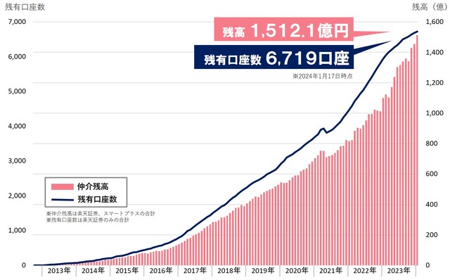 お客様の長期的な資産運用をプランニングから実行、継続フォローまで一貫してサポートするゴールベースプランニングを実践し、仲介残高を伸ばしています。創業以来、楽天証券1社での業務委託契約でしたが、2023年1月よりスマートプラス社と共同開発した一任運用サービス「Smart Manager」の取り扱いを開始しました。2024年1月17日時点で、楽天証券での仲介残高が1,356.9億円、Smart Managerの仲介残高が155.2億円となっております。