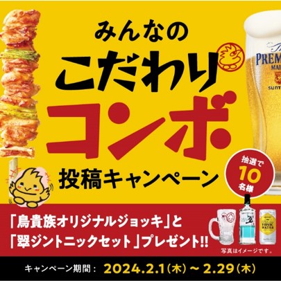 応募方法:Xにて、注文した自分のこだわりコンボの写真を「#みんなのこだわりコンボ #鳥貴族」をつけ、投稿することで応募完了。応募者の中から抽選で10名様に「鳥貴族オリジナルジョッキ」と「翠ジントニックセット」をプレゼント。