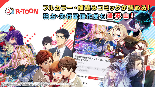 「R-TOON」では、ファンタジーのワクワク感とサスペンスを楽しめる『骨董魔法具は令嬢アリスに囁く~王室古物商の事件録~』、人気の悪役令嬢もの『悪役令嬢は死神パパに復讐がしたいのに! ~人生2周目、パパの心の声が可愛すぎてまさかの愛され物語!?~』、非日常ほのぼのファンタジー『素のままぐらしの living』など、トゥーンクラッカーやストレートエッジ、少年画報社らパートナー企業と共同制作をしたオリジナル作品を多数揃えています。さらに、2023年にドラマ版が注目を集めた『今日もあなたに太陽を ~精神科ナースのダイアリー~』、AIをテーマにした2019年韓国SFアワード大賞受賞作『橋の上のチャチャ』など韓国で人気の日本未発表作品を配信します。また、ニトロプラスの虚淵 玄氏が原案・脚本・総監修を担当する武侠ファンタジー人形劇『Thunderbolt Fantasy 東離劍遊紀』を原作とする初のフルカラーデジタルコミックもお楽しみいただけます。今後も順次、オリジナル作品を含む様々なジャンルの作品を配信予定です。