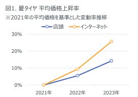 2023年のタイヤ全体の数量前年比は7%減と低調であった。夏タイヤは全体で数量前年比8%減、店頭では数量前年比7%減、インターネットでは同10%減とマイナス成長であった。特に14インチ以下の軽自動車サイズが店頭では数量前年比9%減と減少し、インターネットでは同20%減と大幅に落ち込んだ。夏タイヤの平均価格は店頭では前年から8%上昇し10,782円、インターネットでは15%上昇し9,639円となった。2年連続で価格改定が実施されたこともあり、2021年の平均価格からは店頭で14%、インターネットで26%の上昇となった(図1)。販売数量は減少したものの平均価格の上昇に支えられ、金額前年比は店頭では1%増、インターネットでは4%増と微増となった。