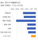 冬タイヤの2023年9-12月期の数量前年比は全体で10%減と二桁マイナスとなった。店頭では数量前年比14%減、特に関東・甲信越では同21%減と前年を大幅に割り込み、インターネットでは同5%減であった(図2)。冬タイヤの最盛期である12月の販売が、数量前年比25%減と著しく減少したことが影響した。冬タイヤの平均価格は店頭では13,123円と前年から7%上昇したことに対し、インターネットではプレミアム製品の構成比が下がったことが一因となり、11,682円と1%下落した。金額前年比は店頭では8%減、インターネットでは2%減となった。